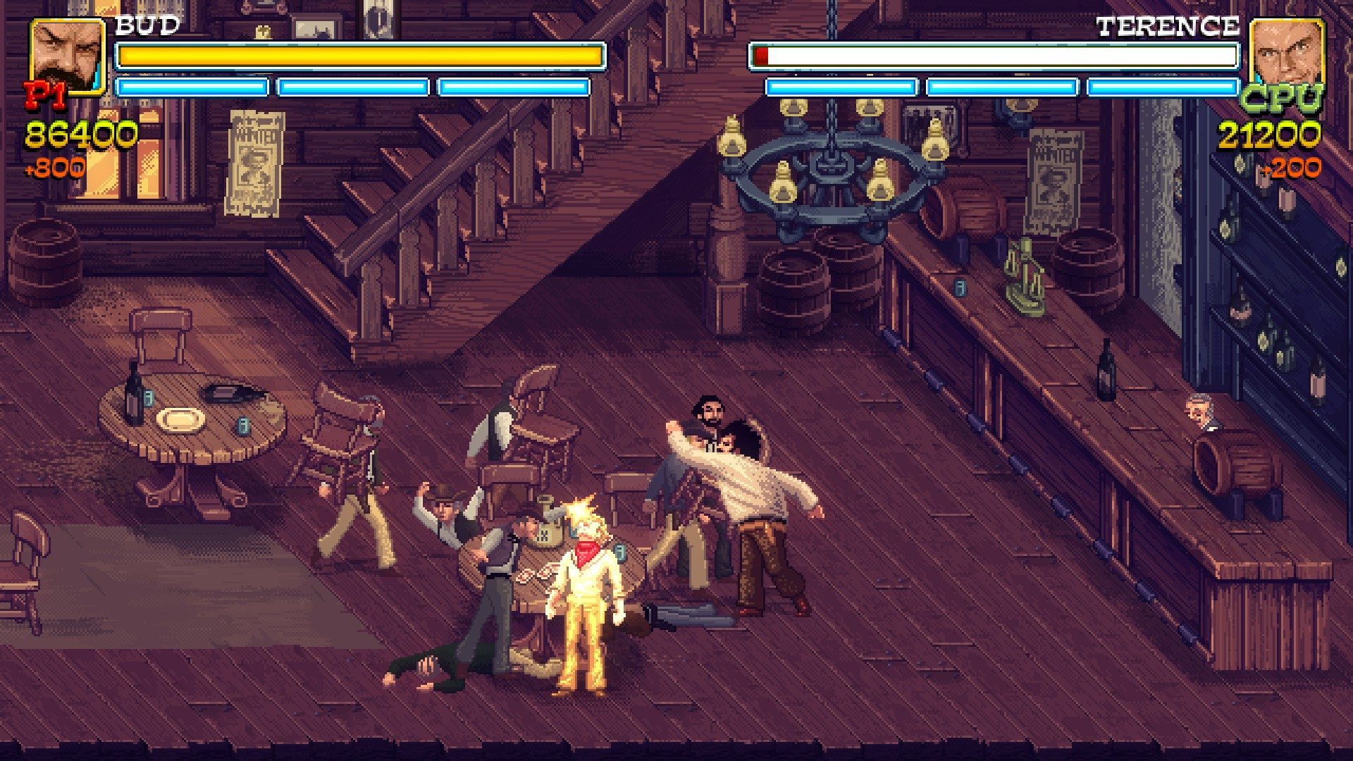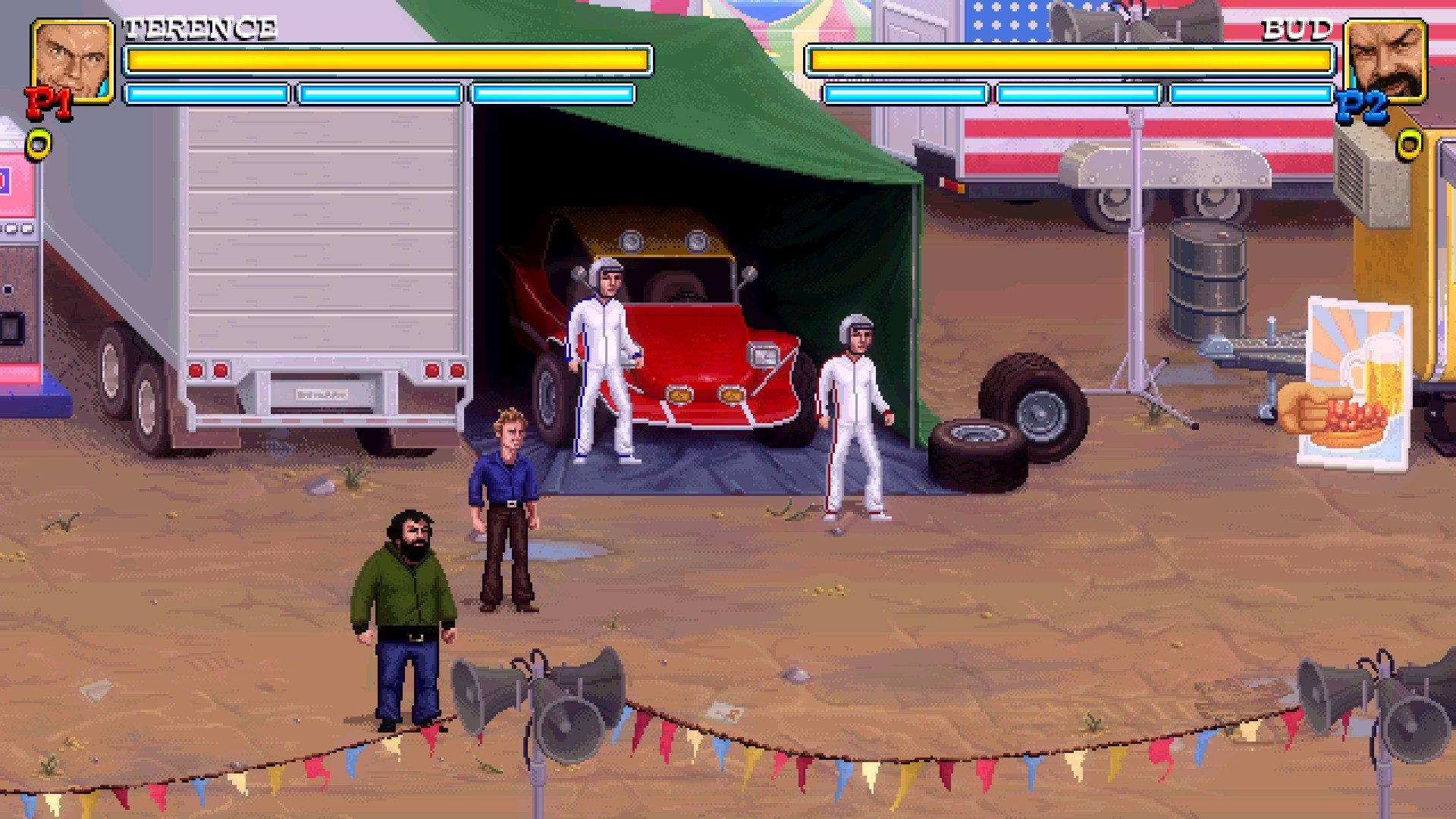 - Bud, grosso e forzuto capace di stordire con un solo pugno i nemici, può anche caricare i gruppi creando un vero e proprio strike in combattimento. E’ l’unico che può sollevare e lanciare gli avversari.