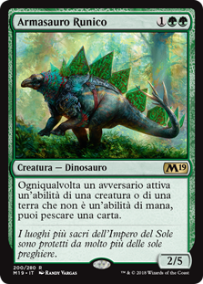 L’Armasauro Runico fa parte di un filone di carte verdi che tende a punire chi gioca usando mezzi che vanno oltre quelli “naturali”. Oltre ad avere una buona capacità difensiva vista la sua costituzione è una carta molto simpatica nelle partite in formati multiplayer, difficilmente i nostri avversari elimineranno subito in modo mirato una creatura così poco minacciosa, ed intanto potremmo ricavarne diverse carte prima che qualcuno si decida a resettare il campo.