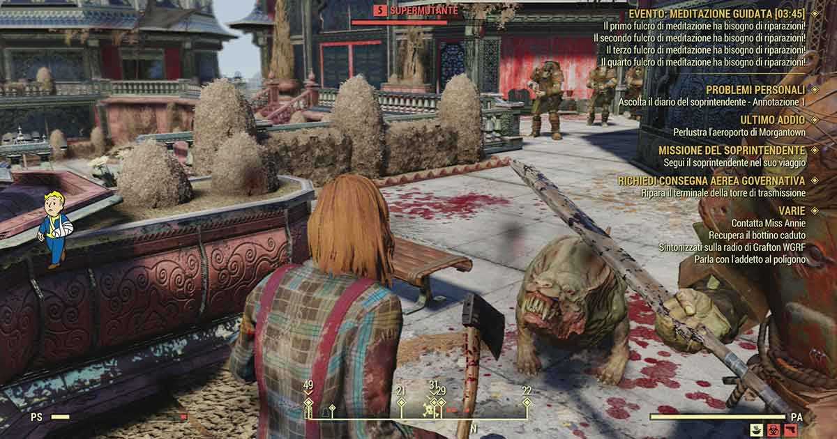 La cosa più strana però l’abbiamo vista ancora più ad Est, una volta entrati nel Palazzo della strada ventosa. Questa strana villa in cima alle montagne sembra un vecchio monastero abbandonato nel quale è possibile affrontare l’evento temporaneo Meditazione Guidata. Dopo aver acceso un braciere siamo stati guidati da una voce rilassante alla ricerca della trascendenza e verso la riparazione di 4 fulcri di meditazione. La cosa più assurda è che questa voce continuava a parlare fornendoci aneddoti sulla calma e sull’auto controllo mentre un branco di Supermutanti tentava in ogni modo di fermare la nostra ascesa alla trascendenza. Inutile dire che il gruppo dei Supermutanti e i loro cani feroci e stato molto più “trascendente” di noi!