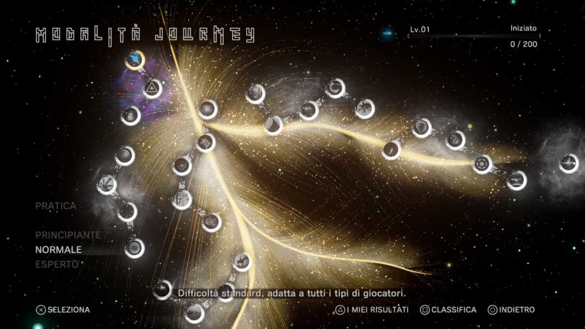 La modalità Journey ci inoltra in varie aree che rappresentano i livelli di gioco. Questi sono mostrati come stelle di una costellazione. Selezionato il primo livello, The Deep, la festa di colori comincia. Eh sì, perché il monocromatismo dell’originale lascia il posto a luci psichedeliche, a immagini sullo sfondo molto evocative, figure geometriche e concentriche che danzano alle spalle della consueta griglia su cui piovono i tetramini. Il sound è fantastico, accompagnandoci con musiche ambient in taluni casi, con ritmi vertiginosi e inaspettati in tra l’altri.