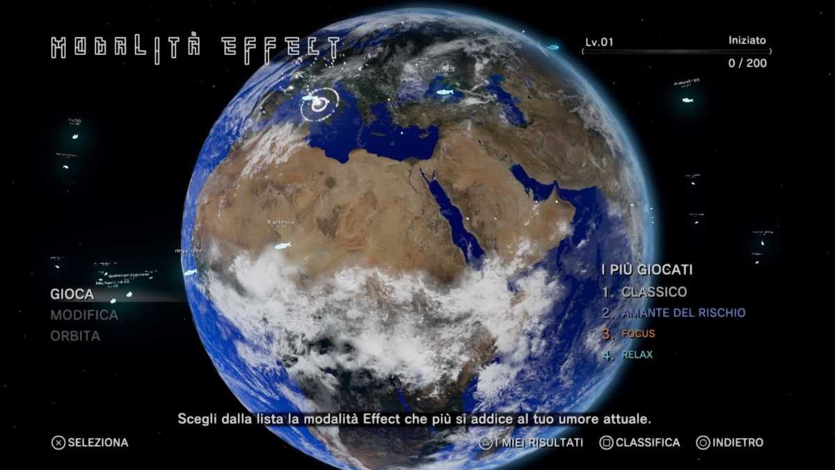 La seconda modalità, Effect, ci permette invece di confrontare i nostri risultati con quelli di altri giocatori in tutto il mondo. Possiamo accedere alle classifiche dei livelli più giocati e, navigando su un mappamondo virtuale, giocare i livelli raggruppati in base al paese selezionato.