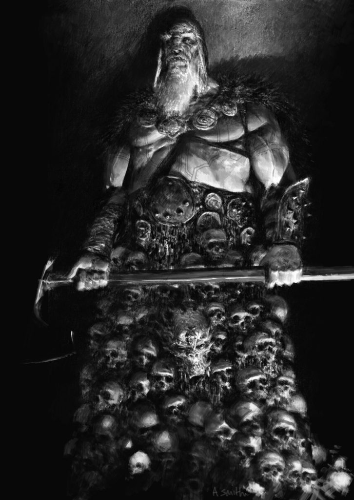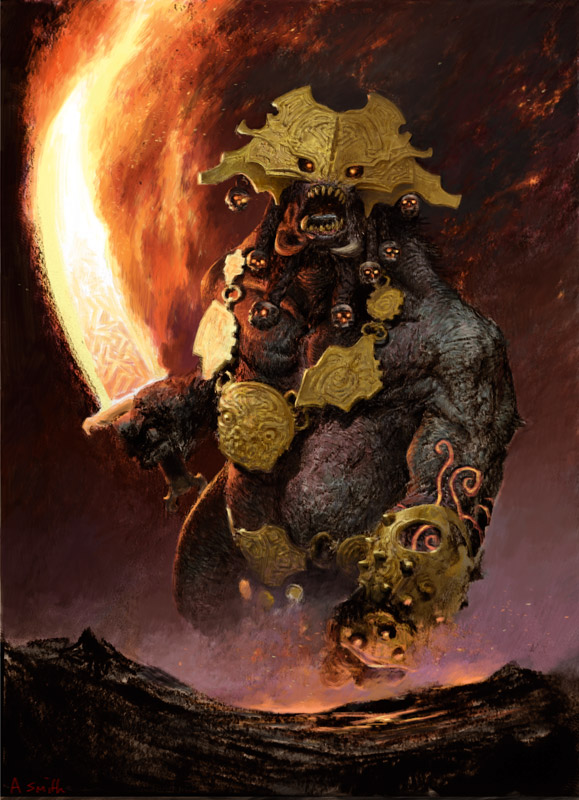 Spettacolare l’illustrazione di Surtr, il gigante di fuoco.