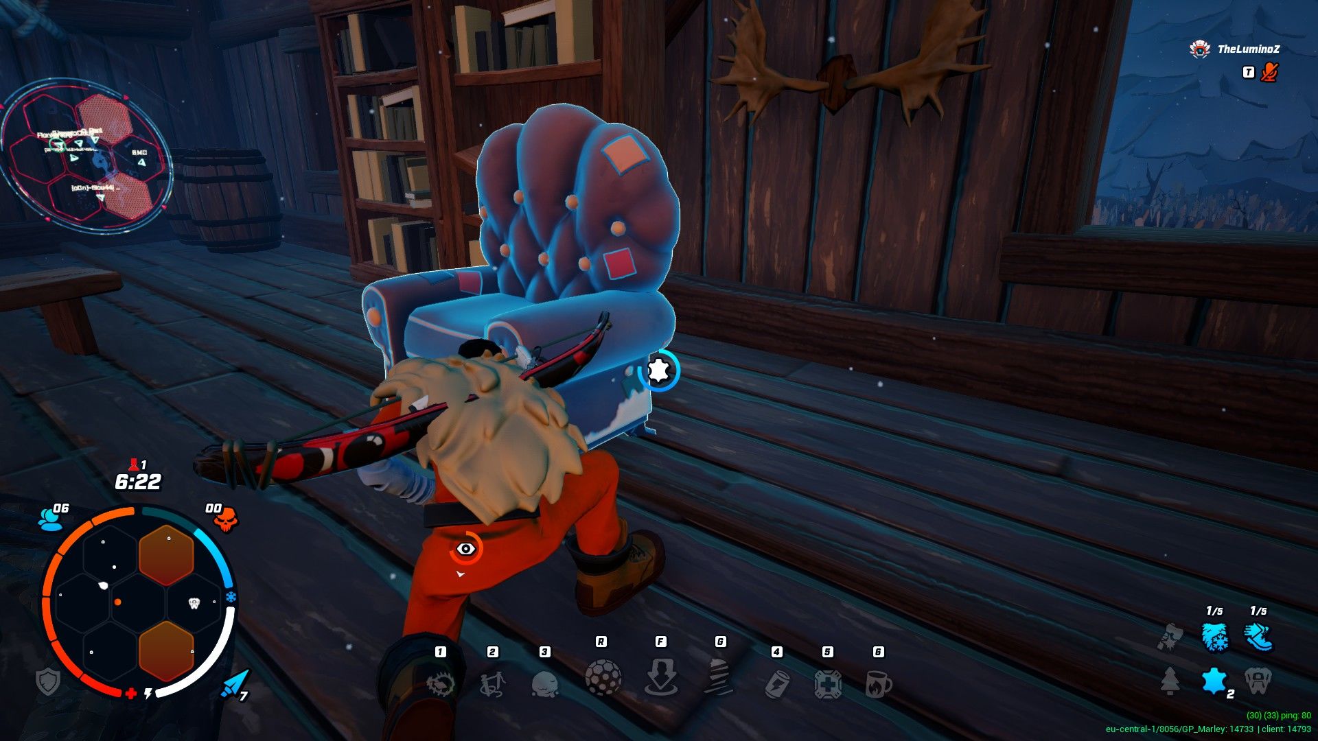 Attenzione però a non tagliare troppi alberi, scuoiare troppe poltrone o accendere fuochi in luoghi aperti perché qualcuno potrebbe mettersi sulle vostre tracce. Questo è sicuramente il secondo aspetto più interessante di questo gioco, l’investigazione. Trovare un albero tagliato da un altro giocatore, ad esempio, ci permetterà di individuarlo per pochi secondi dando vita ad una vera caccia all’uomo, così facendo si ha meno la sensazione di giocare ad un nascondino armato lasciando aperte le possibilità di tattiche per sviare i nostri avversari.