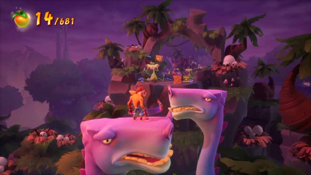 Proprio in questo livello scopriamo anche un’altra grande novità di Crash 4: L’esplorazione. I livelli, infatti, non sono più dei semplici corridoi in 3D o 2.5D ma presentano tantissime strade e passaggi nascosti pieni di casse e frutti wumpa. Proprio per questo sarà possibile spostare leggermente la telecamera con la levetta destra per sbirciare ai lati dello schermo in cerca di qualche segreto.