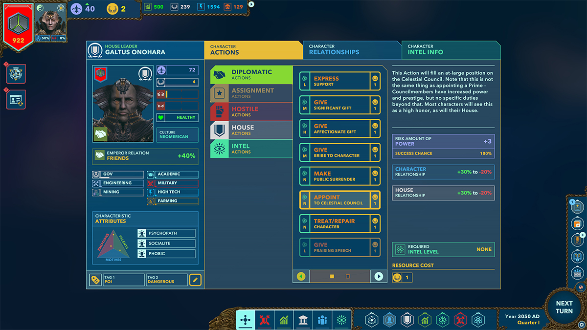 Il controllo sulla popolazione e sui bonus dei pianeti sotto il controllo, è determinato indirettamente dalle scelte del giocatore, il quale ha il “solo“ potere di incaricare i Vicerè della gestione dei compiti. Il giocatore prende decisioni strategiche come chi piazzare in comando per una missione, a quale Casata fornire un pianeta appena colonizzato, quali guerre combattere, cosa esplorare e come espandersi.