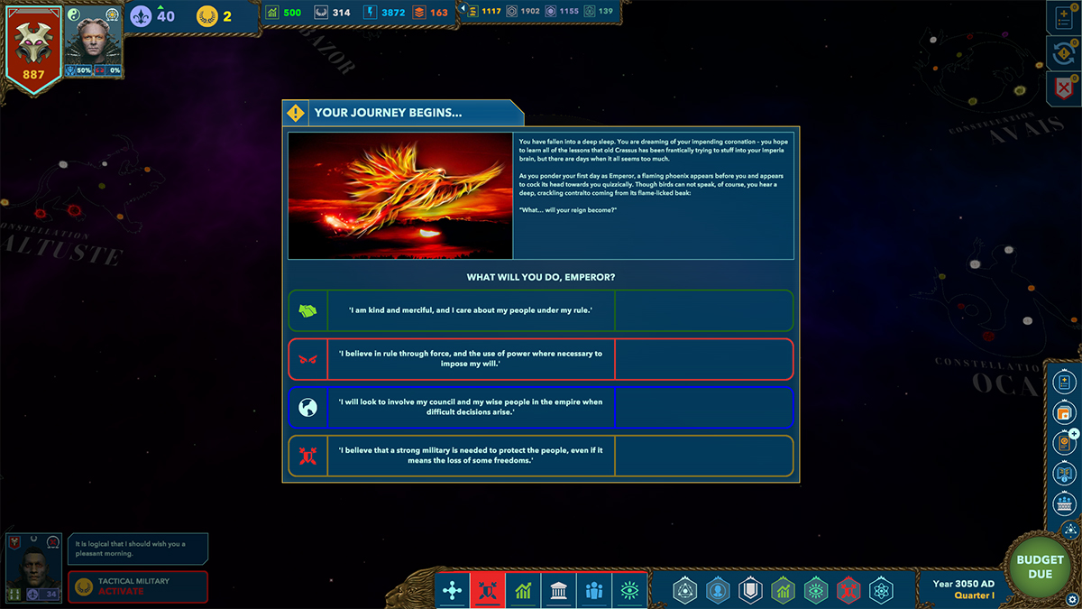 Parte del divertimento dovrebbe derivare anche dalla gestione degli Action Points, perché l’Imperatore ha possibilità limitate di scelta nonostante la mole di richieste e di informazioni che gli arriveranno: ogni anno è fatto di 4 turni, il che vuol dire dare priorità alle cose che al giocatore sembrano più essenziali.