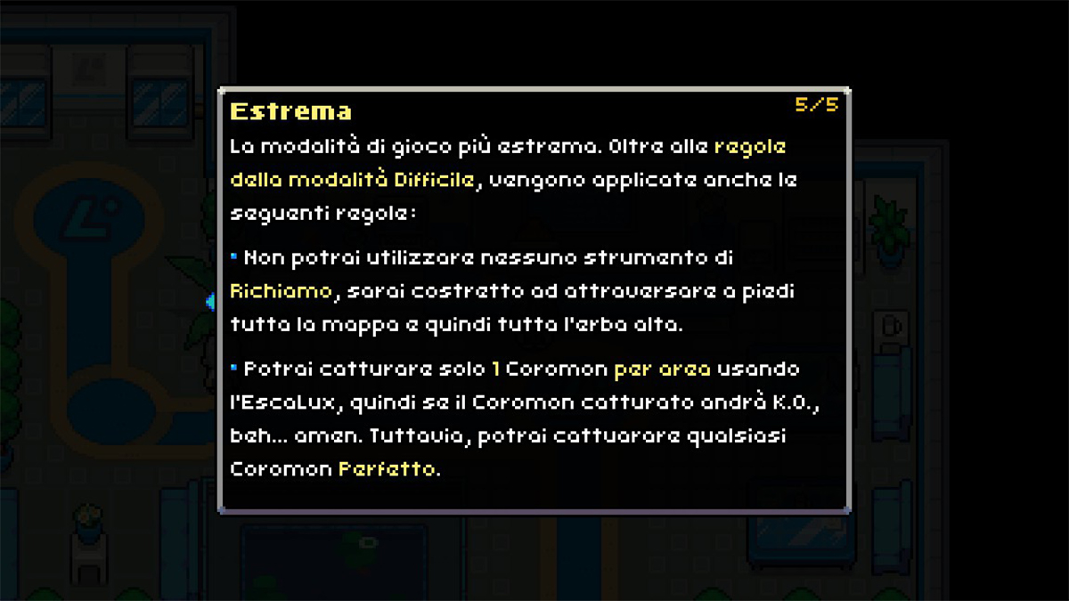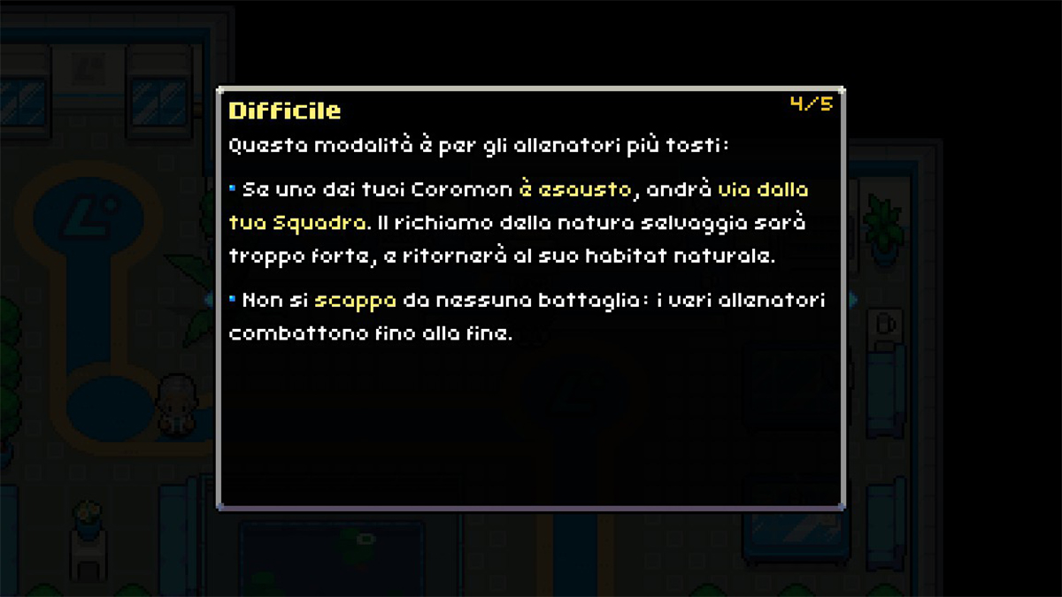 Si percepisce su più livelli che Coromon è stato realizzato con tanto amore per i Pokémon e, soprattutto, per i suoi fan. Molte delle introduzioni in questo videogioco arrivano in soccorso proprio ai punti che sono stati sempre criticati. Per esempio è assente il processo macchinoso di allevamento delle creature per far avere loro delle statistiche performanti: tutto è leggibile a schermo ed è modificabile ad ogni nuovo livello raggiunto dal mostriciattolo, come succede in molti altri RPG.