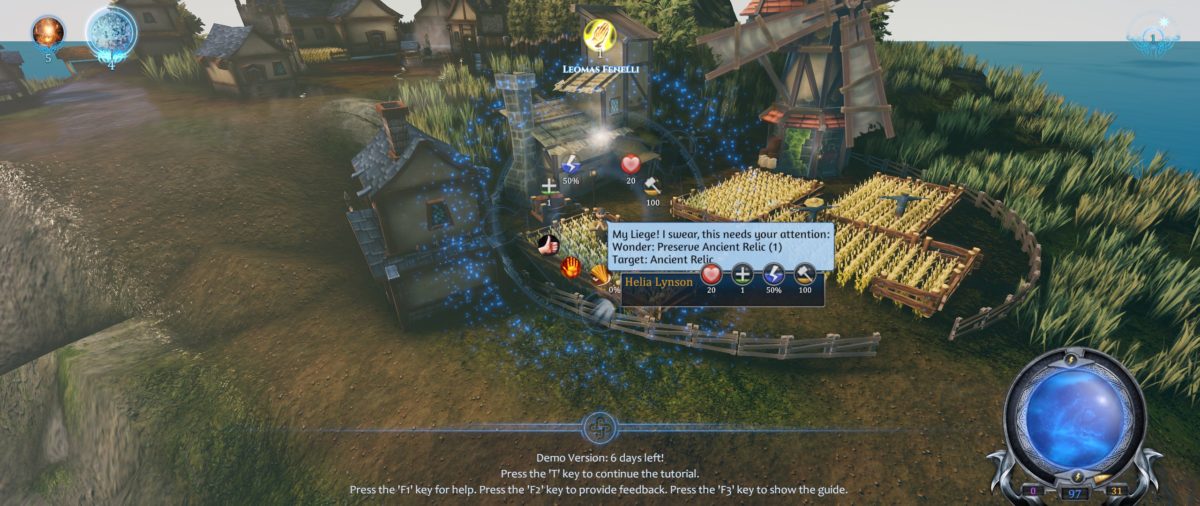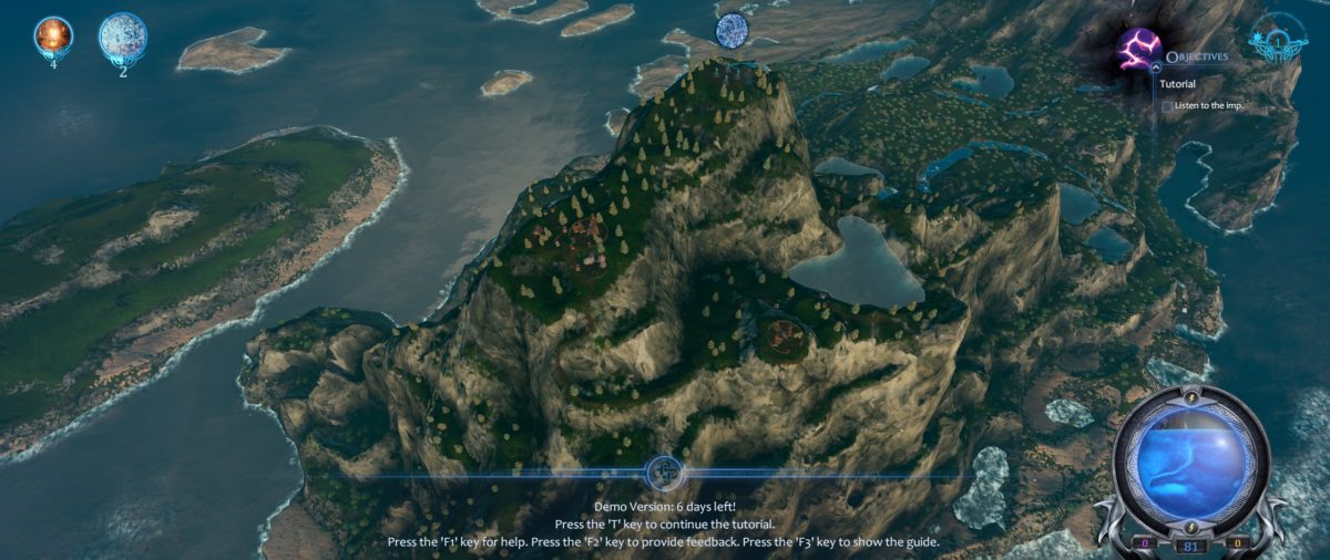 Il ruolo del giocatore, dunque, è quello di una divinità al cospetto di persone e insediamenti che possono venerarla o averne timore. La demo è ambientata su un’isola-continente gremita di insediamenti, dove ai due opposti ci sono due divinità: il giocatore e il suo avversario. A guidarci nella demo c’è un puntino luminoso, equiparabile ai consiglieri in forme di diavoletto e angioletto di Black & White, ma in questo caso completamente amorfo. Dopo avergli assegnato un nome, è il momento di farci insegnare con un breve tutorial le basi di gioco: i comandi della camera e le azioni essenziali per fare proseliti.