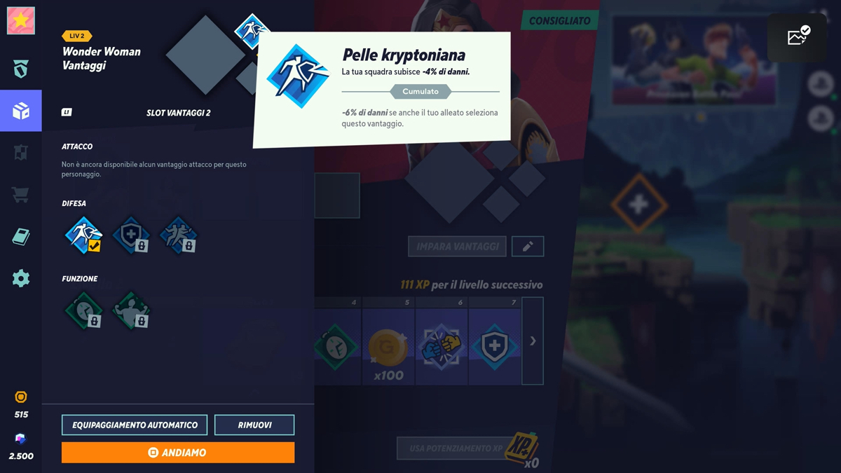 La particolarità, inoltre, è quella che nelle partite 2v2 se entrambi i personaggi di una squadra equipaggiano lo stesso vantaggio, questo aumenta il bonus conferito; l’esempio pratico è proprio Pelle Kryptoniana che passa dal 4% al 6% di riduzione danno subito.