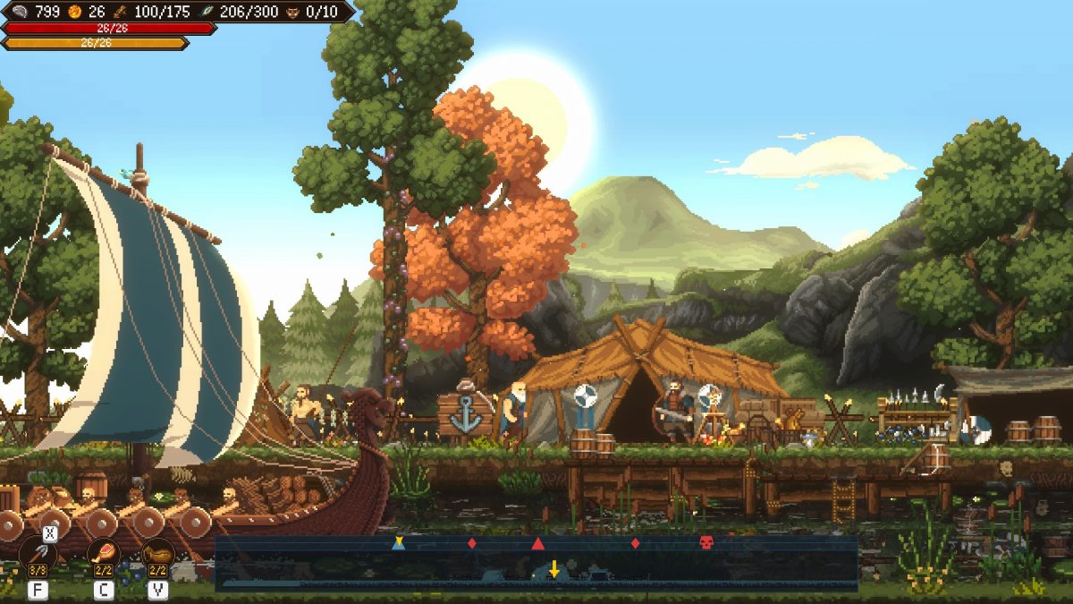 Insomma, il gameplay di Sons of Valhalla si configura così, rapido e indolore fin da subito. Dopo aver conquistato un villaggio si costruiscono edifici per riposarsi, per farmare risorse o per addestrare nuovi vichinghi da portarsi in guerra, e ci si prepara in questa maniera a nuovi combattimenti e nuovi assedi, mentre il mondo di gioco scorre in direzione orizzontale tra un pixel e l’altro, tra uno scenario incantevole e uno apocalittico.