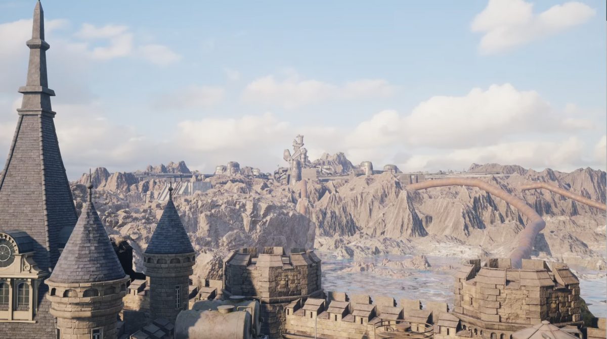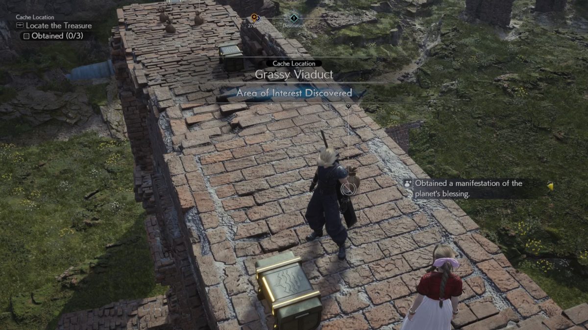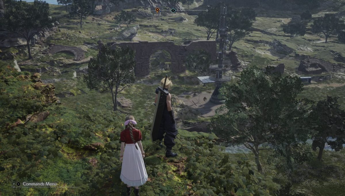 L’ultima parte della prova londinese ha permesso di scorrazzare in libertà per le Grasslands, la prima area aperta del gioco. È bene ribadire quanto sembra ormai chiaro: Final Fantasy VII Rebirth non è totalmente a mondo aperto, ma ha una struttura per così dire a fisarmonica, fatta di vaste aree aperte intervallate da sezioni di raccordo in ambienti più circoscritti. L’area aperta esplorabile in questa sezione è una vasta pianura frastagliata, una prateria cinta da montagne da un lato e da una costa a strapiombo sul mare dall’altro, su cui il nostro sguardo di giocatori si estende a perdita d’occhio. L’abbandono del matte painting in favore di background interamente poligonali ha migliorato sensibilmente il senso di maestosità generale rispetto a Remake, che pure non sfigurava affatto dal punto di vista estetico. Quasi tutto ciò che si vede è raggiungibile (e dove non arrivano i piedi nudi potrebbero, in futuro, arrivare i chocobo) e i punti di interesse non mancano di risaltare subito all’occhio, invogliando il giocatore a muoversi nella loro direzione.