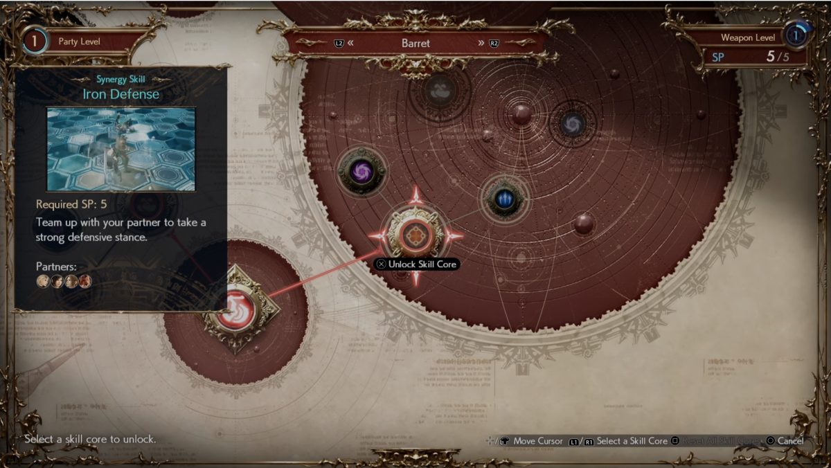 Poco fa ho citato i folios, ma di cosa si tratta? Anche questa è un’aggiunta di Rebirth rispetto a Remake e consiste in una sorta di skilltree personalizzato per ciascun personaggio, cui potremo far apprendere nuove abilità investendo punti abilità (Skill Points, SP). C’è un po’ di tutto, dal grezzo aumento di statistiche a nuove abilità sinergiche. Con una meccanica reminiscente della Sferografia di FF X, l’acquisizione di un determinato core sbloccherà l’accesso a quelli ad esso collegati.