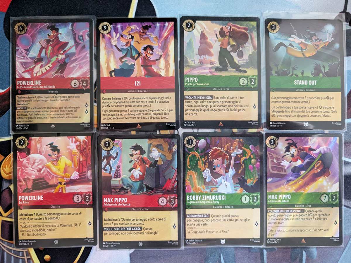 Come se i vari Powerline (con quello di costo 6 che può addirittura giocare canzoni di costo 9 o inferiore gratis) e Max Pippo con Melodioso non bastassero, a rendere questo mazzo molto interessante arriva la fusione con smeraldo. Ho sempre voluto giocare un mazzo con questi due inchiostri, ma solo adesso Lorcana mi ha dato la possibilità di farlo davvero e in maniera competitiva. Max Pippo infatti risulta essere una carta davvero potente anche nella sua versione di Smeraldo e pagando un inchiostro permette di riprendere dagli scarti una canzone con costo 3 o inferiore (per non parlare del Max Pippo leggendario che permette invece di giocare nuovamente una canzone dagli scarti un po’ come la vecchia Ursula – Ingannatrice di tutti ma senza limitazioni di costo).