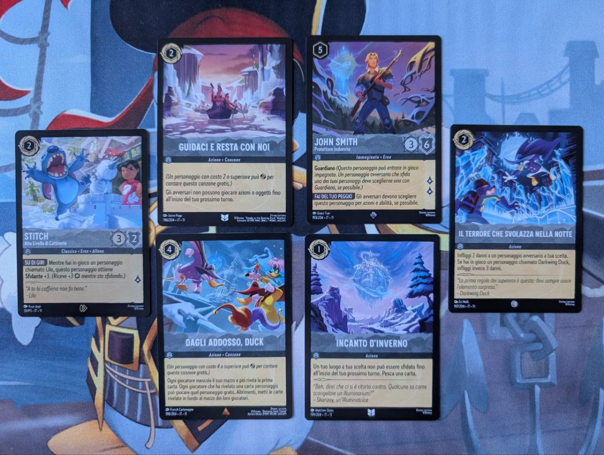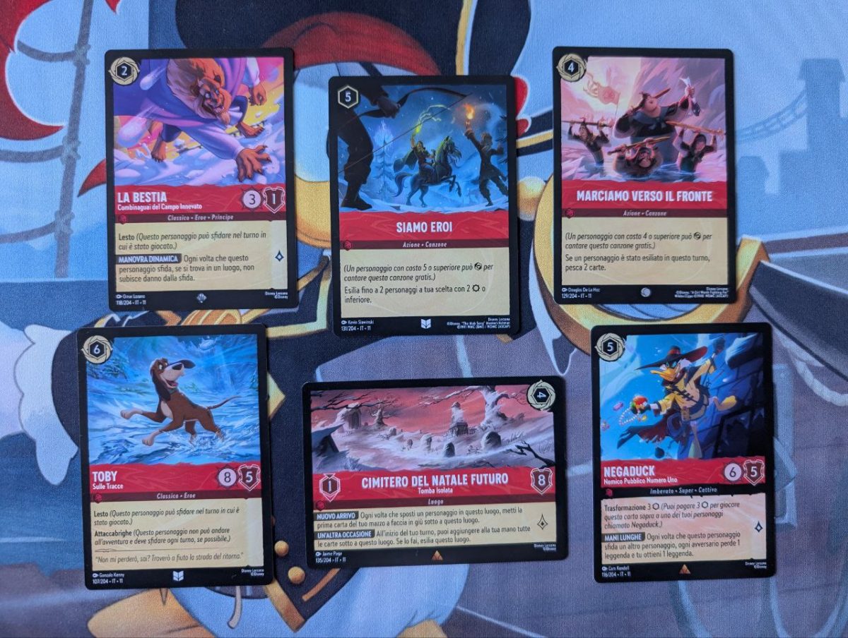 Questo set 11 di Lorcana resuscita alcuni inchiostri, come il rubino, che era diventato quasi inutilizzabile, specie nel competitivo. Grazie alle nuove carte con abilità “Sfavorito”, presenti in ogni inchiostro, offre una chance di rimonta a chi parte per secondo e aggiunge qualche meccanica davvero nuova per quanto riguarda i luoghi che iniziano ad interagire davvero con le altre carte. Molte delle nuove aggiunte sono però facilmente dimenticabili, gli oggetti ancora non riescono a trovare (o ritrovare) il loro posto nel TCG e il design di questo Incanto d’Inverno, non è così ispirato come quello del set scorso. Un peccato perché ci aspettavamo tanto dalle carte di Darkwing Duck, sia lato abilità che design, ma ci hanno deluso su entrambi i fronti. Non resta che aspettare l’arrivo del set 12, Lande Sconosciute e vedere come cambierà il gioco insieme ai personaggi Pixar.