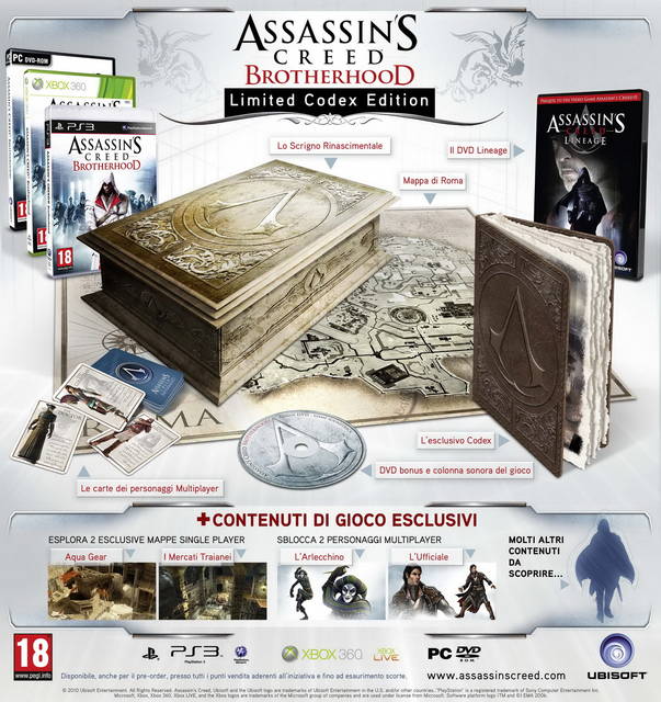 Questo non vuol dire che noi Europei non godremo di una stupenda versioncina tutta sfarzosa di Assassin’s Creed: Brotherhood, perché la nostra cara software house francese non poteva dimenticare il suo continente di origine, rilasciando la Limited Codex Edition!