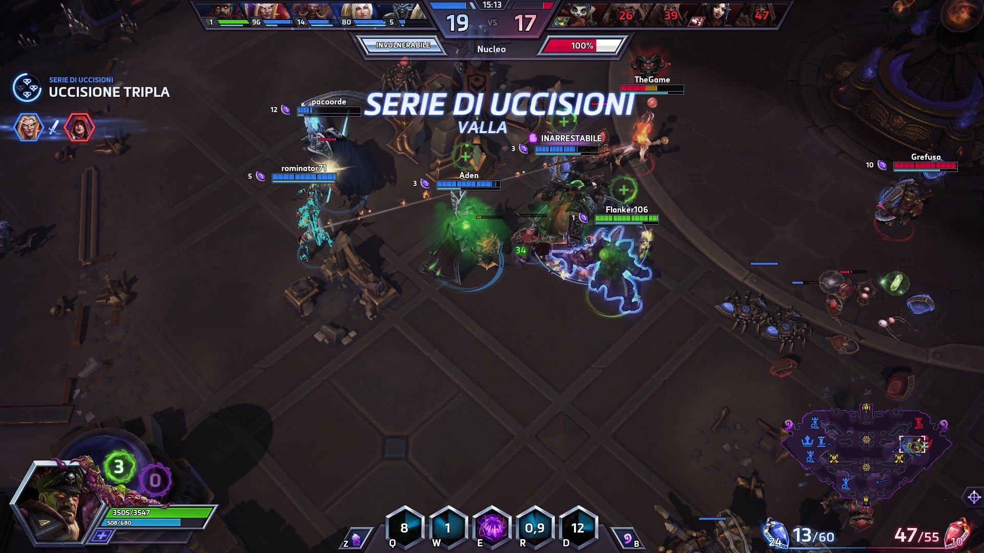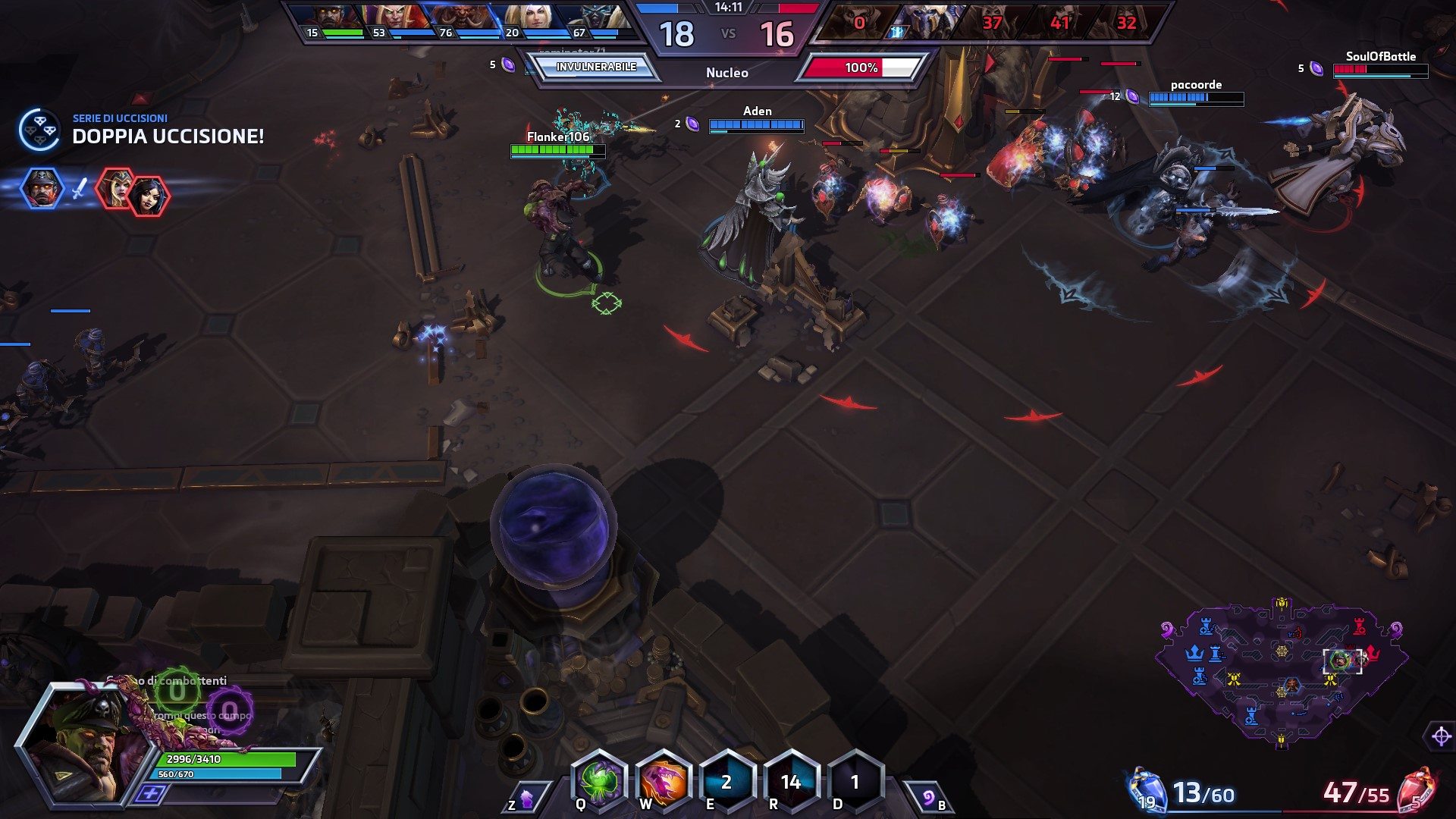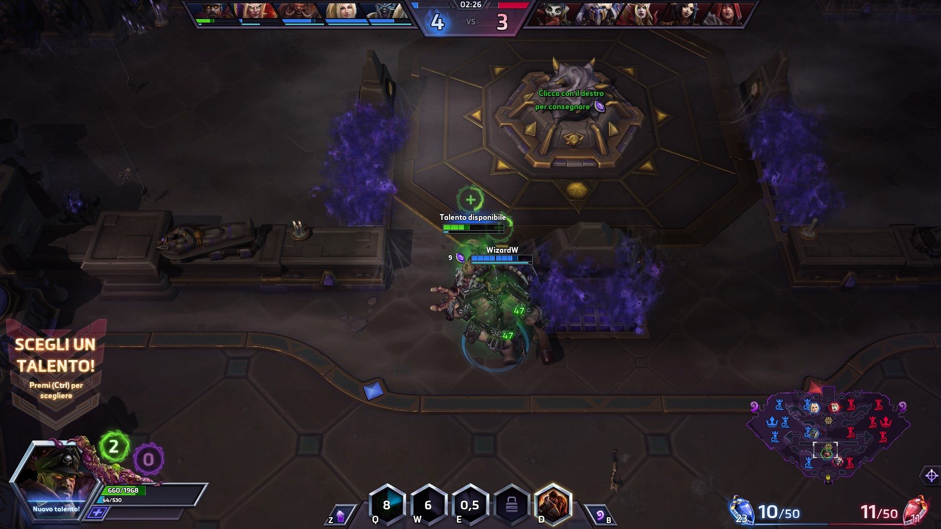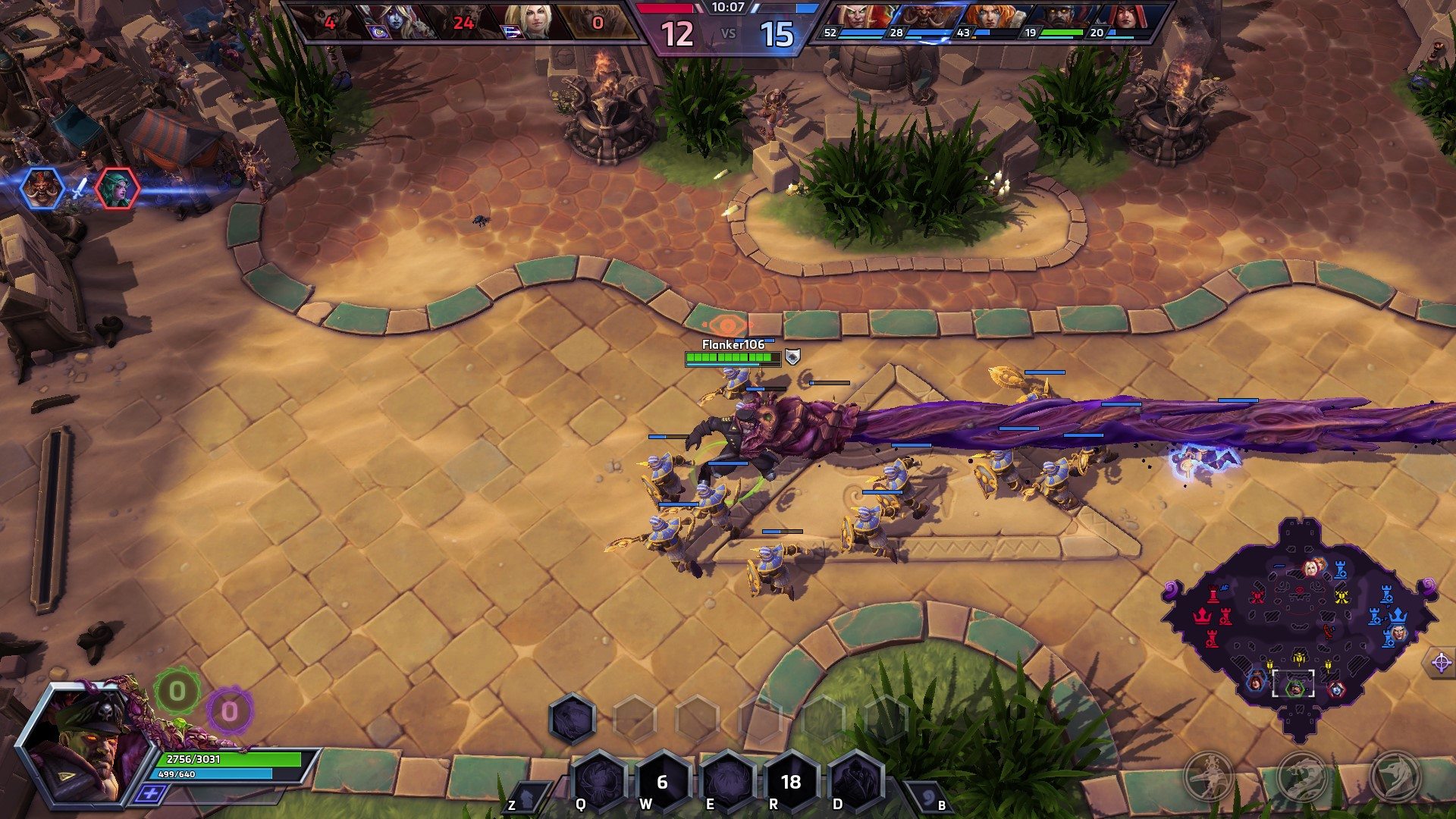 Garrosh è un tank puro, da “bravo” Capoguerra dà il suo meglio come ariete all’interno della formazione. La forza di questo eroe sta nel muoversi in gruppo visto che non eccelle nei combattimenti 1v1 a causa delle sue skill un po’ lente. Il suo tratto passivo gli permette di aumentare la resistenza per ogni percentuale di vita mancante, ciò lo rende capace di sopravvivere anche a molti danni. Una tattica con cui sono riuscito a sbaragliare gli avversari è stata quella di guidare come un vero generale i miei compagni sul campo di battaglia, provocando (con una delle abilità R) i nemici costringendoli ad attaccarmi mentre gli alleati facevano da fiancheggiatori, proprio come un tank in World of Warcraft! Combinando in modo differente i talenti è possibile creare una build più dedicata all’attacco ed il controllo inserendo abilità attive come la spallata e la possibilità di lanciare i propri alleati.