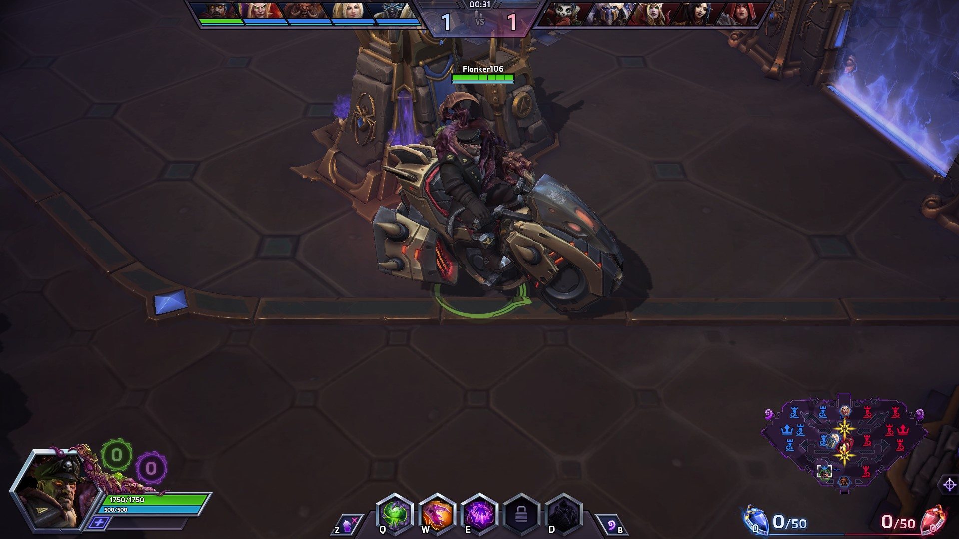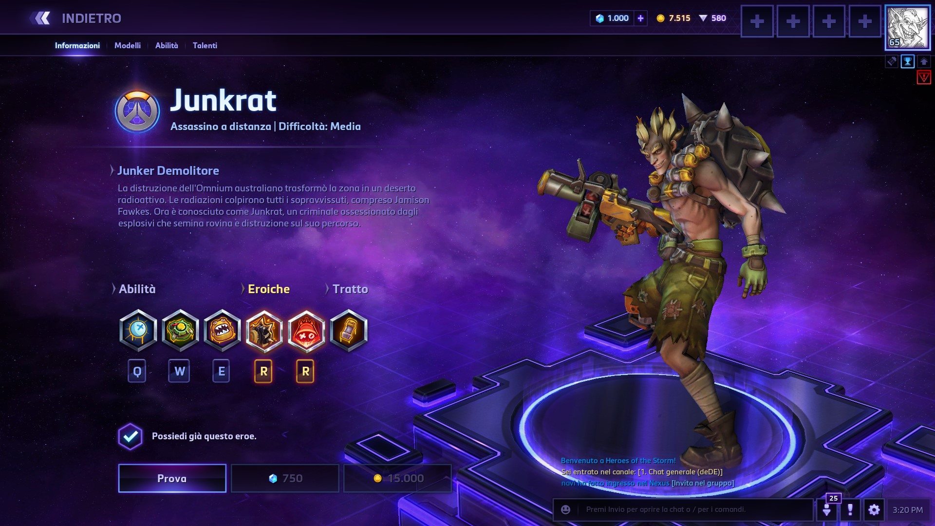 - R – Corsa missilistica: Seconda abilità eroica gli permette di cavalcare un razzo che cade in picchiata nel punto selezionato infliggendo ingenti danni ed attivando il suo tratto passivo.