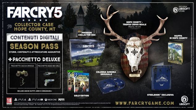 Per ampliare ulteriormente l’esperienza di gioco, la Hope County, MT Collector’s Case darà accesso al Season Pass di Far Cry 5, che include storie, contenuti ed equipaggiamenti aggiuntivi, oltre al Pacchetto Digital Deluxe, che comprende ulteriori veicoli, armi e abiti.