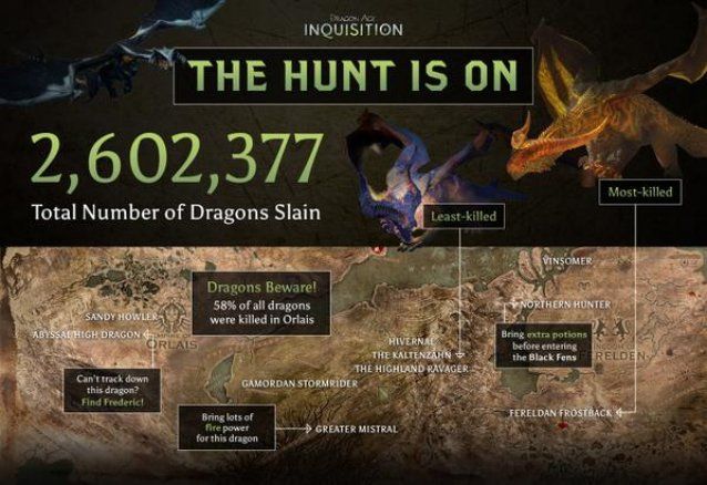 BioWare ha diffuso quest’oggi, attraverso un’infografica, alcune curiosità e statistiche per quanto riguarda Dragon Age: Inquisition. Fino a oggi, dal momento del lancio del gioco su PC, PlayStation 3, PlayStation 4, Xbox 360 e Xbox One, sono stati uccisi 2.602.377 draghi da parte di tutti gli utenti del mondo.