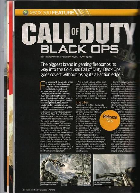 Call of Duty: Black Ops é un first person shooter sviluppato da Treyarch e pubblicato da Activision previsto su Xbox 360, Playstation 3, PC e Nintendo Wii a partire dal 9 Novembre 2010!