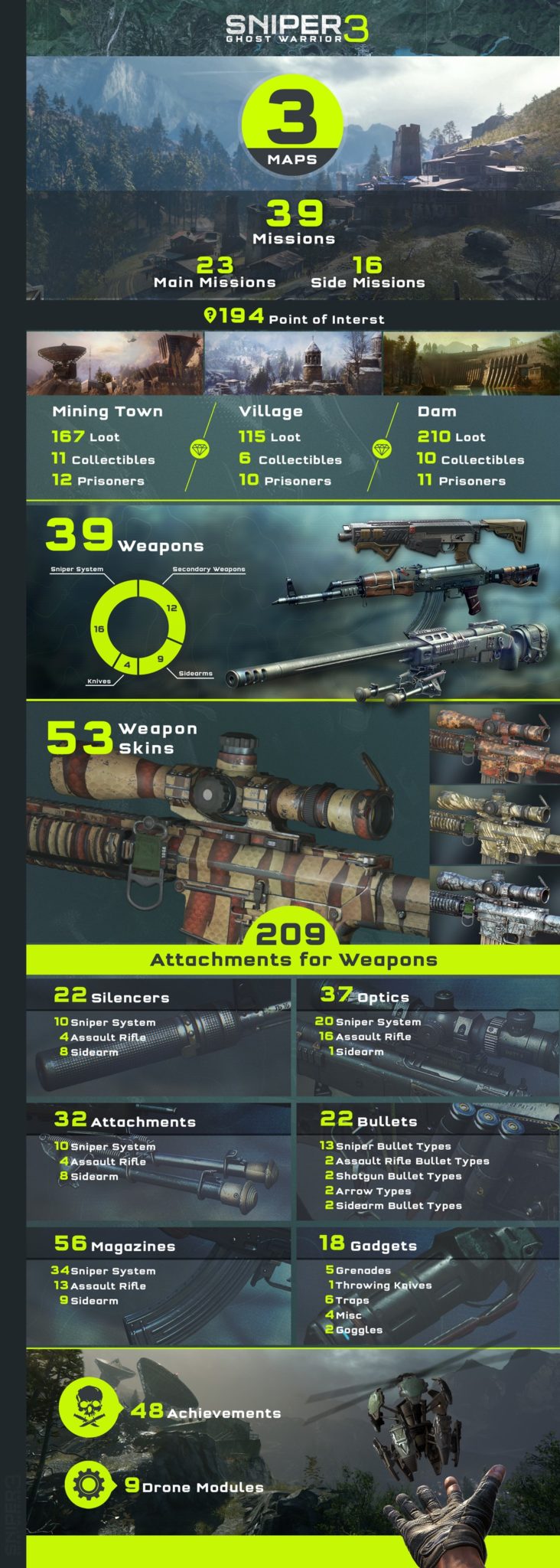 CI Games ha continuato ad ascoltare i feedback dei giocatori durante tutto lo sviluppo di Sniper Ghost Warrior. Sniper Ghost Warrior 3 è senza dubbio il più grande progetto mai creato di CI Games. CI Games non potrebbe essere più orgogliosa dei risultati che è stata in grado di raggiungere con questo progetto. Per ringraziare tutti i giocatori, CI Games ha preparato un’infografica che illustra alcuni straordinari contenuti del gioco.