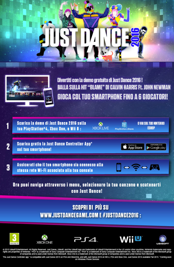 MILANO, 3 marzo 2017 — Just Dance ® 2017 è disponibile per Nintendo Switch™, il primo gioco di Ubisoft rilasciato al lancio della nuova console. La famosa “How Deep Is Your Love” di Calvin Harris & Disciples sarà disponibile come traccia esclusiva per i possessori di Nintendo Switch su Just Dance Unlimited.* Questa hit si andrà ad aggiungere alle già presenti 40 tracce disponibili nel gioco, tra cui “Sorry” di Justin Bieber, “Lean On” di Major Lazer Ft. MØ & DJ Snake, “Single Ladies (Put a Ring on It)” di Beyoncé, nuove hit come “Don’t Wanna Know” dei Maroon 5 e classici come “Don’t Stop Me Now” dei Queen.