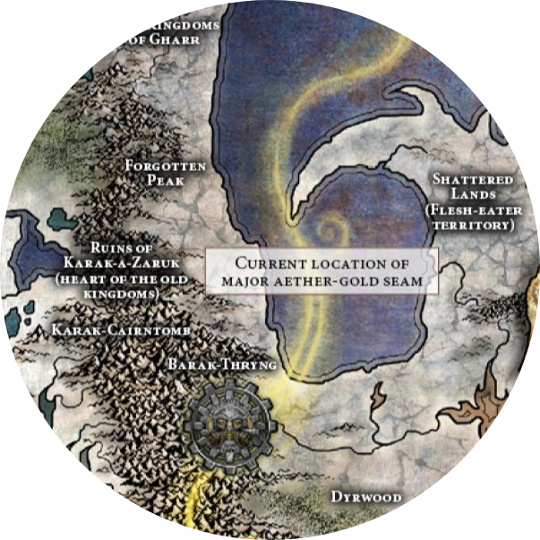 Esplorando le regioni centrali delle proprie isole, i duardin scoprirono ricchi depositi di chamonite, ossia la sostanza simile a mercurio che si forma quando energie di Chamon si condensano. Dopo che nelle Montagne di Azgal fu inventato il ghiottone eterico, un dispositivo simile a una siringa, gli etermanti di Azgal e Sigyorn cominciarono ad estrarla, categorizzarla e razionarla cosicché le isole occidentali, che fossero popolate da duardin, golem o umani, avessero energia sufficiente con cui azionare le proprie forge. In più, divenne anche una valuta diffusa che trovò il suo equilibrio in una goccia di chamonite equivalente a una cesta piena di monete d’oro. Questo portò a uno spostamento di massa da parte di svariate popolazioni e a una crescita esponenziale di operazioni di rivendicazione che portarono diverse fazioni rivali a competere o addirittura farsi guerra per estrarre risorse magiche prima degli altri. Nonostante questo, non tutto fu guerra e rivalità e la chamonite non fu l’unica grande risorsa estratta su Chamon. Innovatori e inventori, pionieri antenati di coloro che sarebbero diventati i Kharadron, padroneggiarono le tecniche di estrazione dell’oro eterico, materiale che ai tempi aleggiava tra i picchi delle Isole Divine. Dandogli il titolo di Respiro di Grungni, si adoperarono per scoprire velocemente metodi per processarlo e raffinarlo, scoprendone potenzialità energetiche pressoché infinite che diedero inizio a un’era di progresso scientifico per gli intraprendenti duardin dei picchi montani.