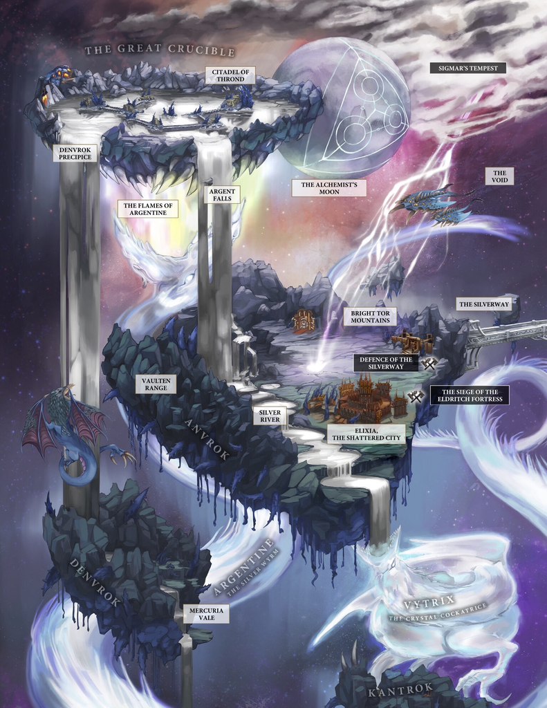 L’urlo di morte del grifone magnetico creò una frattura tra il Regno del Caos e i cieli del Fulcro, aprendo la via a legioni di abomini demoniaci volanti di Tzeentch. Fu in quel momento che l’Età del Mito si poté dichiarare conclusa, lasciando spazio a una nuova e terribile Età del Caos in cui il Fulcro Spirale dovette fare i conti con la fenditura celeste.