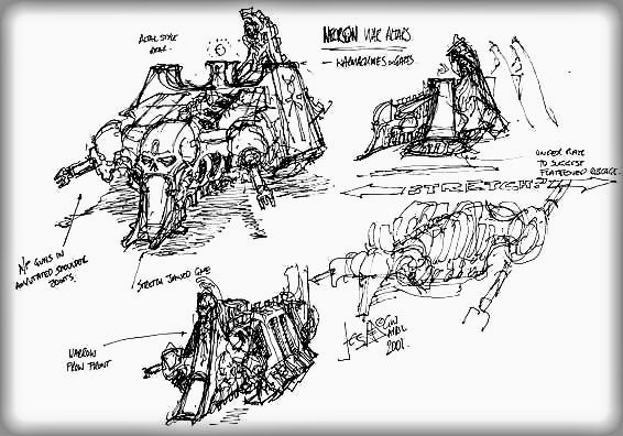 Questo processo subì una costante evoluzione nel corso degli anni. Gli Androidi abbandonarono il proprio legame con il Caos e si lasciò maggiore spazio al tema della nonmorte mescolato, secondo le parole di Jes Goodwin, con qualche ispirazione agli scheletri metallici dei Terminator e all’aspetto di Mean Machine, storico personaggio di 2000 AD. Questo processo ebbe il suo primo risultato con White Dwarf 217, il numero della rivista che abbiamo citato prima e che introdusse nel gioco sia i Guerrieri che gli Scarabei Necron scolpiti da Dave Andrews. Fin dall’inizio, anche grazie al simbolo sul loro petto, si poteva notare un incrocio tra l’ispirazione egizia e mesopotamica, tema poi mantenuto dal primo Necron Lord e dal primo Distruttore, usciti solo un mese dopo con White Dwarf 218.