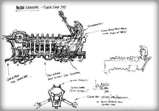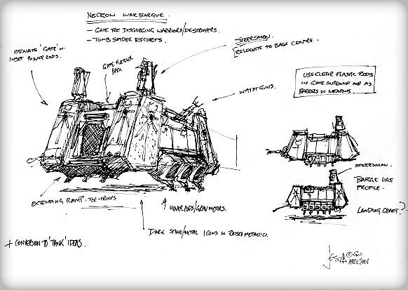 Andy Chambers continuò a coltivare la propria creatura scrivendo Deus Ex Mechanicus, un racconto breve pubblicato nel numero 20 della serie d’antologie Inferno! (Settembre/Ottobre 2000). Nel descrivere la storia di un’esplorazione dell’Adeptus Mechanicus all’interno di rovine Necron, Chambers diede vita a questo antico nemico che nel racconto si rivelava essere un C’tan e ciò non fece altro che sbloccare ulteriormente la fantasia di Jes Goodwin, il quale disegnò ulteriori bozzetti e i primi famosissimi “tubetti verdi” delle armi Necron. L’ispirazione egizio-mesopotamica divenne più forte e man mano si stabilì sempre di più una simbologia legata ad Ankh, scarabei, piramidi, etc.