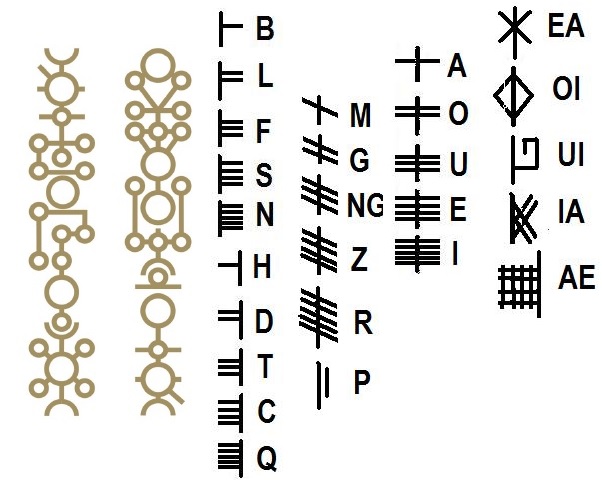 Complessivamente, quindi, sembra che la lingua scritta dei Necrontyr possa essere considerata un incrocio tra la logografia dei geroglifici e l’alfabeto ogham di origini irlandesi. Mentre quest’ultimo si concentra tra abbinamenti linea-linea, la scrittura Necrontyr pare usare un simile binomio linea-cerchio.