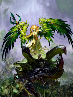 - Guardiana e Vendicatrice: Questi sono solo una coppia dei vari nomi che i due aspetti di Alarielle possiedono, ma possono anche essere identificati come Inverno ed Estate. Da guardiana, Alarielle è una dea difensiva e rinchiusa in se stessa, mentre la vendicatrice, aspetto conosciuto anche come “da battaglia” o “da guerra”, è come la vediamo adesso. Si tratta di una dea guerriera che prende le redini della propria razza vedendo pressoché chiunque come un invasore. Anche i fedeli a Sigmar che hanno costruito città su Ghyran (nonostante siano popolate anche da fedeli ad altre divinità) sono visti come poco più che “invasori benevoli e utili alla causa che quindi non attaccherò”. Ciò che rende Alarielle unica è la sua influenza sui sylvaneth in base all’aspetto che assume. La popolazione sylvaneth è più aggressiva perché influenzata da Alarielle. Alcuni sylvaneth sono persino bloccati in un certo aspetto, come la Dama dei Viticci. Creata da una mano di Alarielle mentre quest’ultima si trovava nel suo aspetto guerriero, la Dama dei Viticci rimase nello stesso aspetto anche quando Alarielle si rinchiuse in quello invernale.