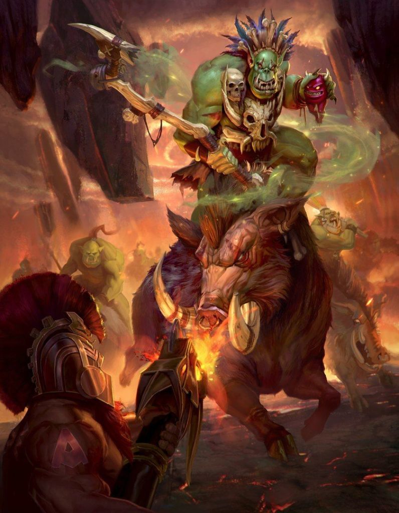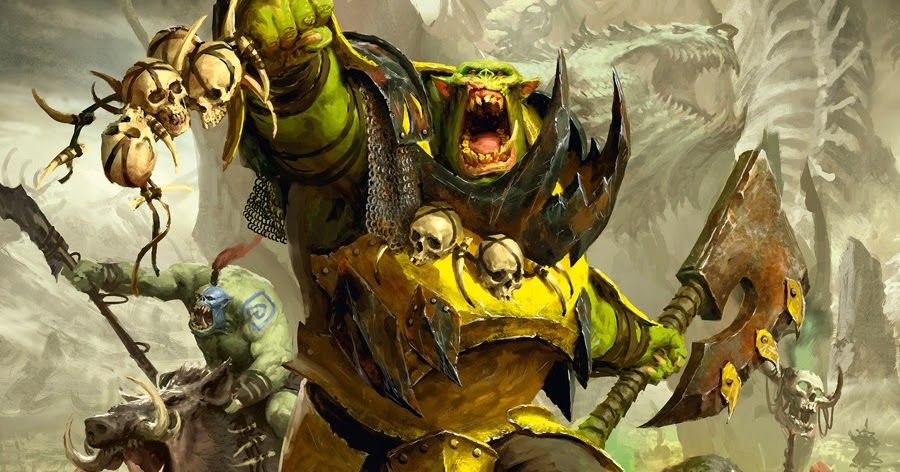 Mentre il primo libro ci racconterà gli ultimi sforzi di Morathi nella sua corsa all’ascensione divina, il racconto The Clobbering ci permette di conoscere Bokkrog, un orruk dei clan Ironjawz che si trova a duellare con il suo simile Grakka la Lancia sotto gli occhi di altri pelleverde, ma in particolare sotto quelli di uno sciamano di cui non conosciamo il nome. Ci viene solo descritto il suo volto dipinto di blu.
