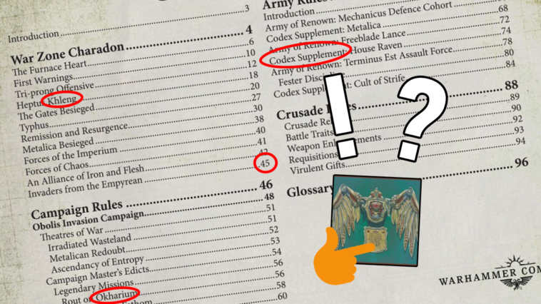 Giovedì 12 marzo Games Workshop ha iniziato ad approfondire i contenuti che potremo trovare all’interno di Zona di Guerra Charadon – Atto I: Il Libro della Ruggine. Finalmente è possibile iniziare a capire cosa aspettarsi da questo manuale narrativo e, fortunatamente, posso dire di non essere rimasto contrariato. Voglio quindi parlarvi delle mie prime impressioni avute osservando questo indice dei contenuti.