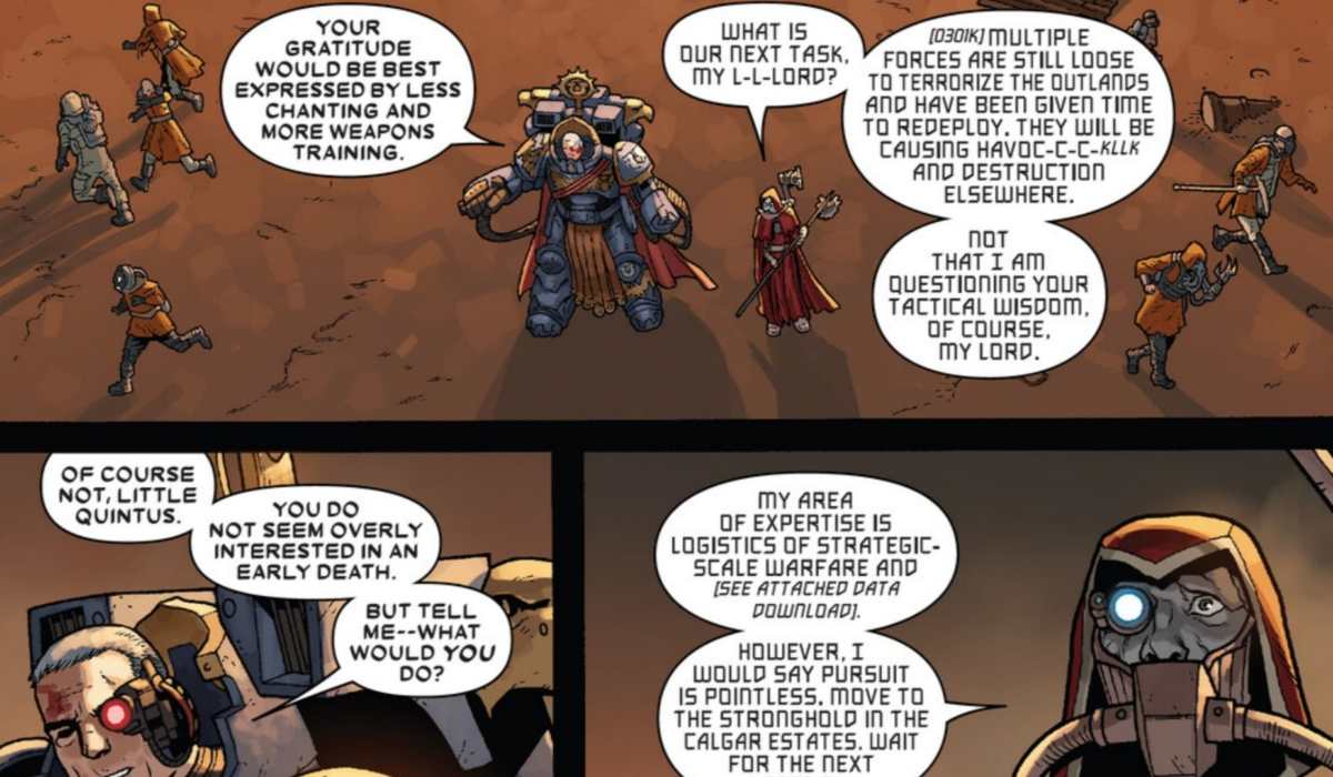 Ecco, questo dialogo è terribile. Detto da un altro personaggio? Nessun problema, piuttosto prevedibile se detto da uno Space Marine qualsiasi. Detto da Marneus? Decisamente no. Marneus Calgar è un personaggio che trova il valore in chiunque, non solo negli Space Marine. Non ritiene che gli umani non-astartes siano semplicemente dei piccoletti inferiori da proteggere, ma che si possono uccidere occasionalmente se ti contraddicono o se ti danno fastidio. Sebbene Marneus abbia posto la propria frase sotto forma di battuta, implica comunque che potrebbe comodamente uccidere qualcuno che mette in dubbio le sue strategie e questo non è Marneus. Se le mette in dubbio perché è un usurpatore che pensa solo ai propri interessi sì, ma in altri casi no. Nel 797.M41, Marneus, alcuni Space Marine e vari soldati della Milizia di Ultramar furono costretti a raggiungere la città di Zalathras a piedi. Gli umani non ressero lo sforzo come gli Astartes e alcuni tra quest’ultimi suggerirono di lasciarli indietro, ma Marneus si rifiutò categoricamente. Dovendo sopravvivere anche ad alcuni attacchi sporadici da parte degli Orki, ordinò di supportare i soldati esausti e/o feriti, arrivando anche a trasportarli sulle proprie spalle se necessario. Marneus stesso portò tra le proprie braccia il Luogotenente Janus dopo giorni e giorni di valoroso dovere.