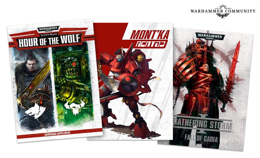 Per quanto riguarda Warhammer 40.000 si partirà dalle campagna narrative uscite dalla 6a edizione in poi, quindi materiale come Sanctus Reach, Shield of Baal, Black Crusade, le varie Zone di Guerra e Gathering Storm.