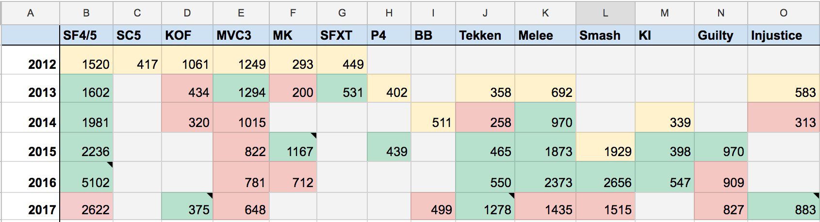 Questa tabella mostra gli iscritti ai tornei divisi per gioco dal 2012 all’edizione di quest’anno. Seppure la magnitudine dell’Evo rimanga comunque di svariati ordini di grandezza superiore a qualunque altro evento della FGC, quest’anno sembra esserci stata una battuta d’arresto. Con l’eccezione di Tekken 7, che ha visto più che raddoppiare i partecipanti e Injustice 2, che ha visto un leggero incremento di partecipazione rispetto a Mortal Kombat X, il precedente prodotto della NetherRealm Studio (comunque inferiore al 2015, l’anno di debutto di MKX), tutti gli altri giochi hanno avuto un calo di affluenza.
