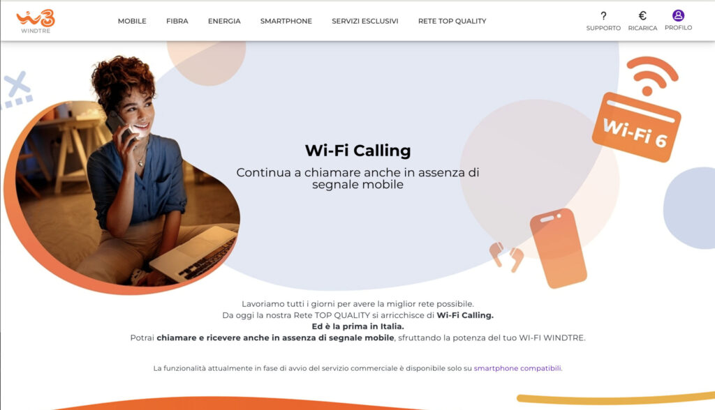 L’operatore telefonico WINDTRE, in data 2 dicembre 2022 ha annunciato il lancio del cosiddetto Wi-Fi Calling. Già nei mesi scorsi era state effettuate delle fasi di prova delle reti ed ora, il momento del lancio è giunto rendendo di fatto WINDTRE la prima compagnia in Itali a sfruttare questa tecnologia, implementando il servizio di telecomunicazione per i propri abbonati