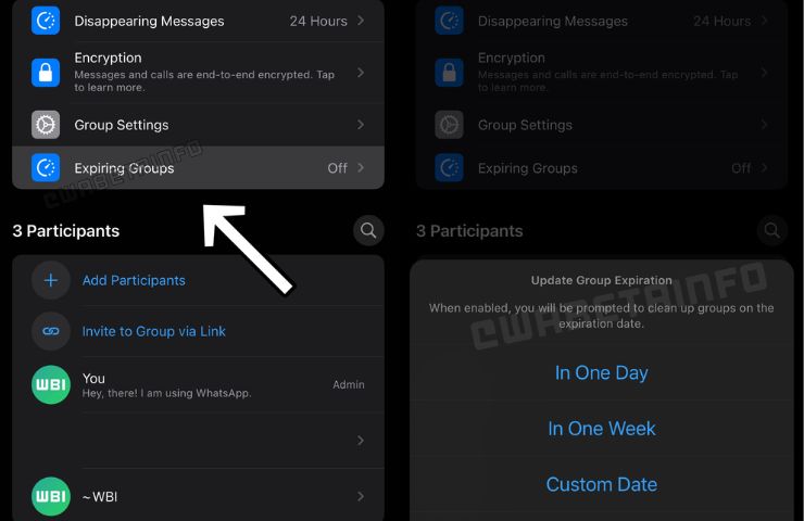 Come si può vedere dallo screenshot, verrà presto aggiunta una nuova opzione per i gruppi WhatsApp, ovvero la possibilità di impostare una data di scadenza.