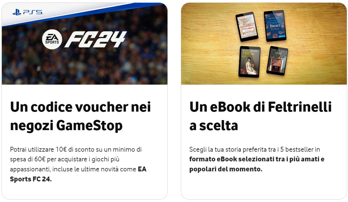 Per quanto riguarda il buono Game Stop, questo è valido per qualsiasi acquisto di importo apri o superiore a €60 complessivi. Inoltre tenete presente che questi bonus aggiuntivi all’offerta Vodafone Red Max Under 25 saranno selezionabili solo fino al 29 dicembre 2023, e riscattabili entro il 31 gennaio 2024. Infine, per usufruirne dovrete aspettare la ricezione di un SMS da parte di Vodafone contenente un link che vi rimanda alla pagina dell’app in cui approfittare dell’offerta. Tale SMS sarà spedito entro due settimane dall’attivazione della sottoscrizione. Dunque qualora voleste approfittarne fate i vostri conti sul calendario!