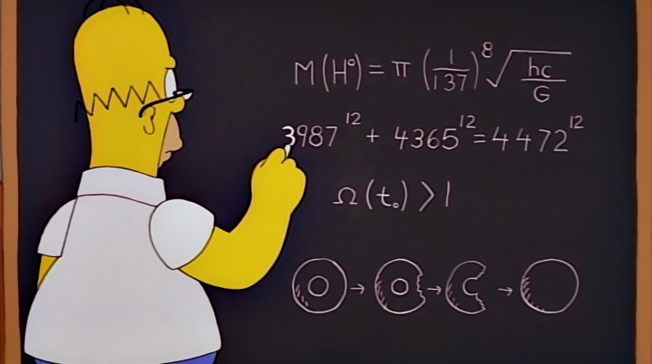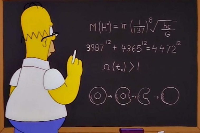 Come detto, le prove dell’esistenza e del funzionamento della “particella di Dio” arrivarono soltanto nel 2012, dopo anni di esperimenti e tentativi. Tuttavia, il fisico Simon Singh, stupendo il mondo, ha confermato che i Simpson ci erano arrivati prima, molto prima. Rivedendo l’episodio della stagione 10, adattato in italiano come “L’inventore di Springfield”, in cui Homer tenta di seguire le orme di Edison, diventando un inventore di successo, il nostro “papino” scrive su una lavagna un’equazione, per cercare di dimostrare la sua teoria dell’universo a forma di ciambella probabilmente.