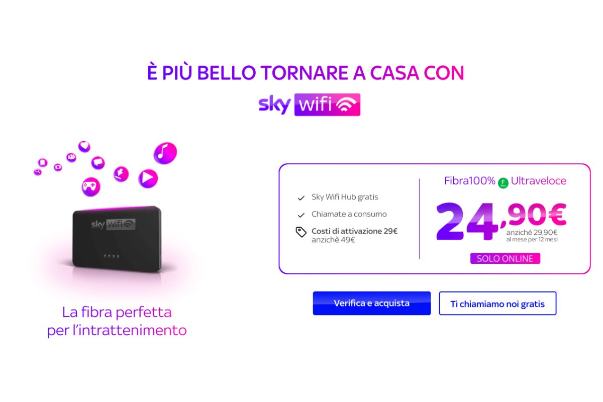 - Sky Wi-Fi: con connessione internet illimitata in FTTC o Fibra FTTH, con annesse chiamate a consumo e modem Wifi Hub al prezzo di 19,90€ al mese per i primi 18 mesi (in seguito la tariffa mensile sarà di 29,90€).
