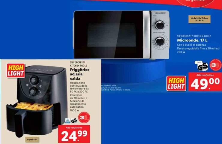 Parlando del microonde si tratta di un microonde da 17 l con 6 livelli di potenza, il consumo è di massimo 700 watt e la durata della cottura può essere regolata fino ad un massimo di 30 minuti. Ideale per cuocere e riscaldare. Il microonde Silvercrest offerto da LIDL è in vendita a 49 euro. Sempre sul volantino si trova anche l’offerta della friggitrice ad aria calda.
