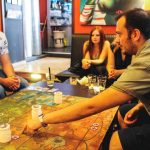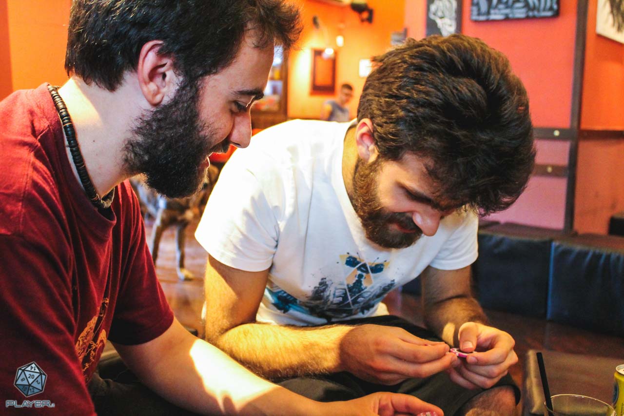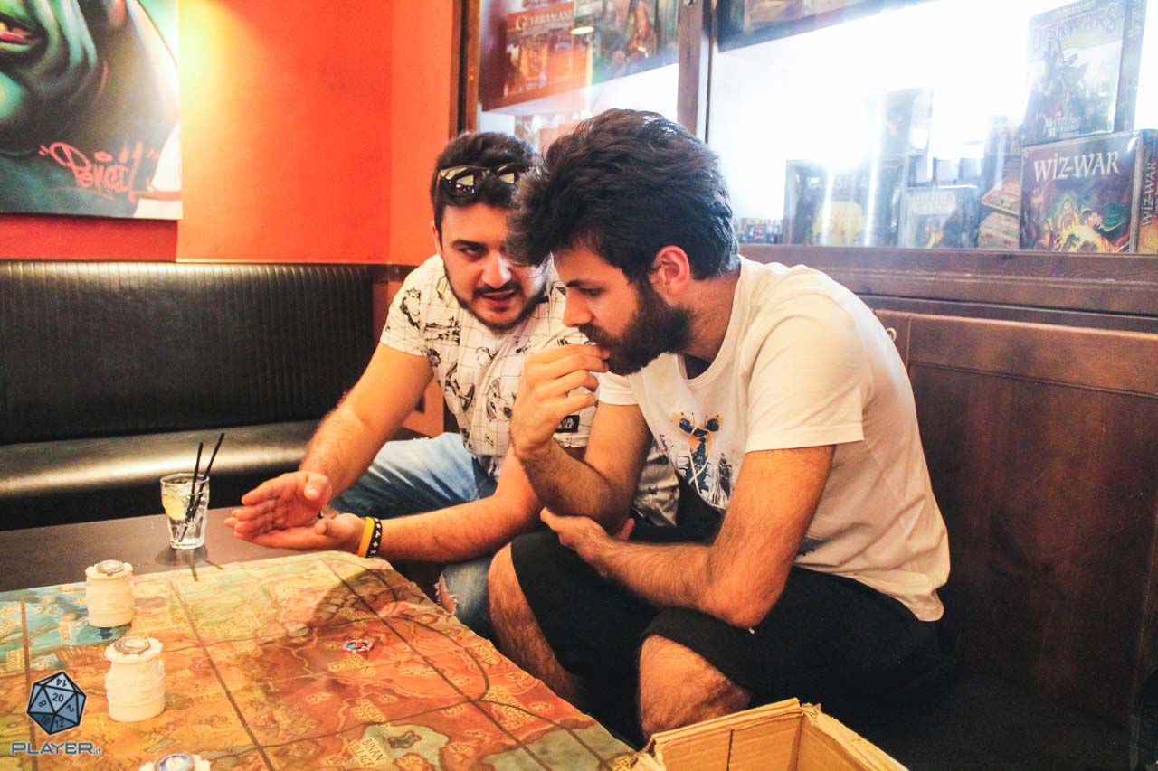 Arrivati al locale ci accolgono Miriam la gestrice del Volver e Simone della Taverna del Gargoyle, altro punto di riferimento per quanto riguarda i giochi da tavolo a Napoli, che ci fanno accomondare al tavolo dove è già disposto il prototipo di Warstones.