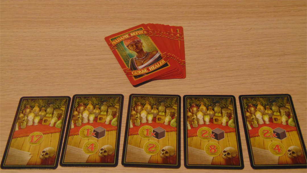 Molti dei tesori così ottenuti, che potremo anche decidere di non prendere, spesso ci daranno delle Maledizioni, che ci segneremo con dei piccoli cubetti di legno neri sulla nostra carta personaggio.