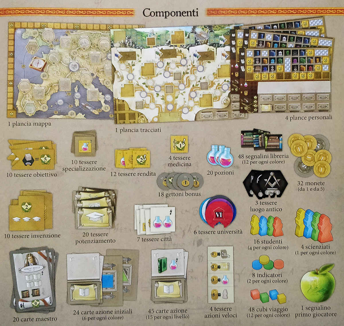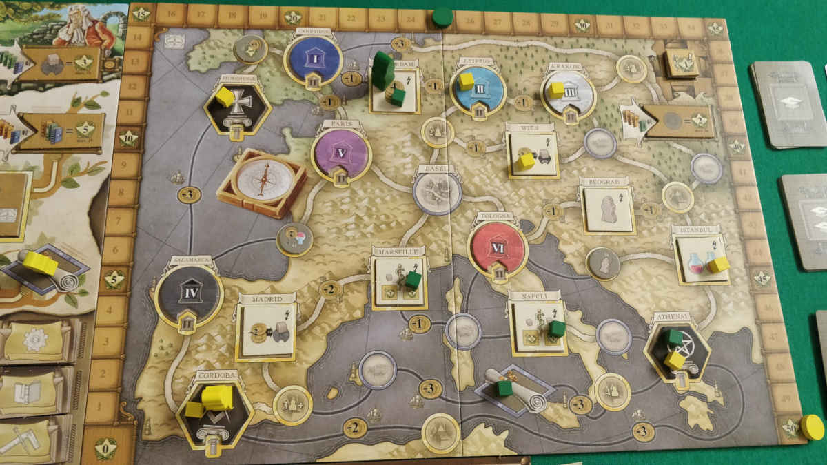 - Viaggio: permette di muovere il proprio Scienziato sulla Plancia Mappa. Similmente al tracciato della sperimentazione, anche qui saranno presenti Gettoni Bonus a disposizione del primo giocatore che raggiungerà determinati luoghi. Sulla mappa sono anche presenti 6 Università e 3 Luoghi Antichi: fermarsi su questi luoghi permetterà al giocatore di prendere un Cubo Viaggio dalla propria plancia e lasciarlo sul luogo. Lo scopo qui è duplice: ogni cubo dopo l’ottavo ci porterà punti vittoria direttamente, inoltre i cubi stessi serviranno per soddisfare alcuni requisiti dell’azione Studio.