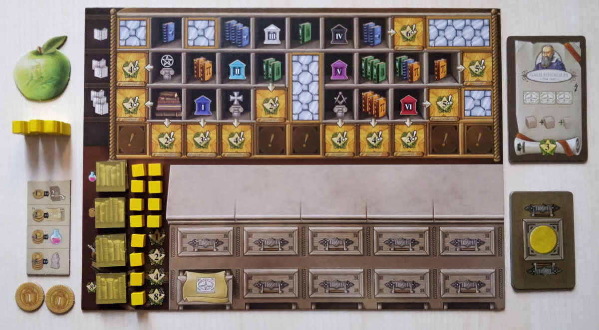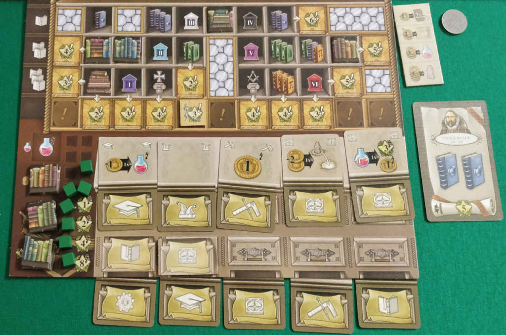Oltre alla preparazione delle plance principali dedicate alla mappa e ai tracciati, ogni giocatore avrà anche una plancia personale scelta casualmente da preparare con cubetti e libri, e dovrà prendersi anche un paio di monete, le carte azione iniziali (tutte bilanciate, ma leggermente differenti per ogni giocatore), e quattro carte maestro tramite draft. Da questo punto di vista lo stato iniziale dei giocatori è pressoché simmetrico.