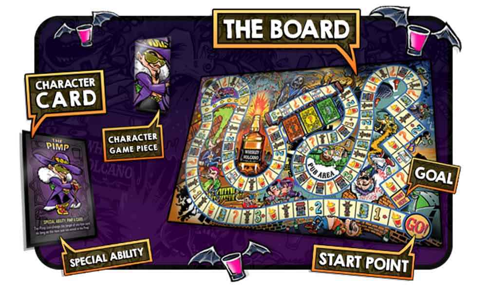 Nel proprio turno si lanciano i dadi e ci si muove dei numeri corrispondenti. A seconda della casella in cui finiremo potremo ottenere diversi risultati come bere uno shot, pescare carte, bere in compagnia, rimanere fermo un turno, o avanzare ancora. Se siete troppo deboli per affrontare la sfida richiesta il prezzo sarà un altro shot, a voi la scelta.