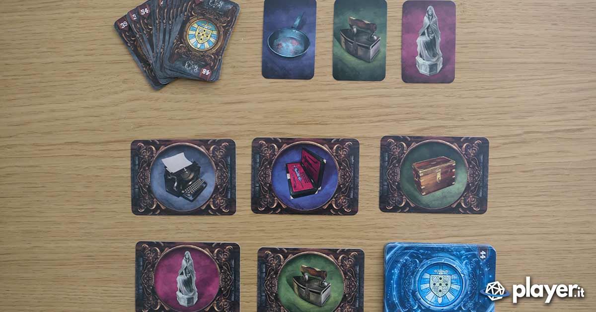 Vediamo un esempio pratico: Si gioca in 4 (3 medium e un fantasma) andranno quindi pescate 6 Carte Medium Personaggio, 6 Luogo e 6 Oggetto. Queste 18 carte andranno messe a tavola mentre, dalle corrispondenti 18 Carte Fantasma, il giocatore “defunto” dovrà sceglierne segretamente solo 9 (3 personaggio, 3 luogo e 3 oggetto) e infilarle dietro il tabellone. Queste sono le carte che i giocatori dovranno indovinare tra quelle sul tavolo. E tra queste sarà nascosto il “tris colpevole” da indovinare alla fine della partita e che viene scelto dal fantasma.