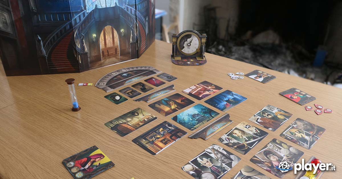 Ad accompagnare questa imponente scenografia, ci sono carte, segnalini e altri strumenti del maniero che vanno sdraiati orizzontalmente diventando loro la vera plancia di gioco e che si trasforma turno dopo turno a seconda delle scoperte dei giocatori. Probabilmente è un’idea che farà un po’ storcere il naso ai perfezionisti del gdt, quelli che stanno continuamente a riposizionare pedine e carte nei loro alloggiamenti (lo so, sono uno di quelli), ma lascia trasparire le sensazioni e gli sviluppi dell’indagine, portando avanti solo gli indizi utili alla scoperta finale.